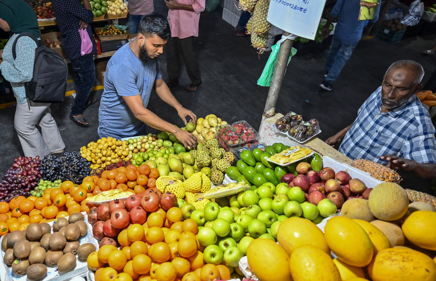 People looking at fruits at a local market stall: The prices of fruits and vegetables frequently bought by locals have gone up just as it did last Ramadan -- Photo: Fayaz Moosa | Mihaaru