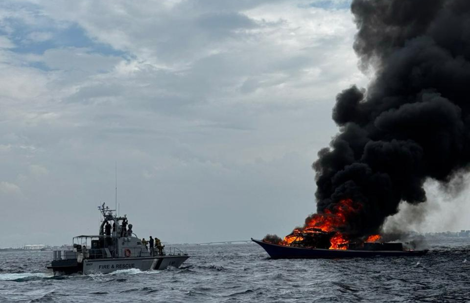 The entire vessel was destroyed in the blaze. Police said five people sustained burn injuries, including two Maldivians and three expatriates. All were brought to Male' for treatment.